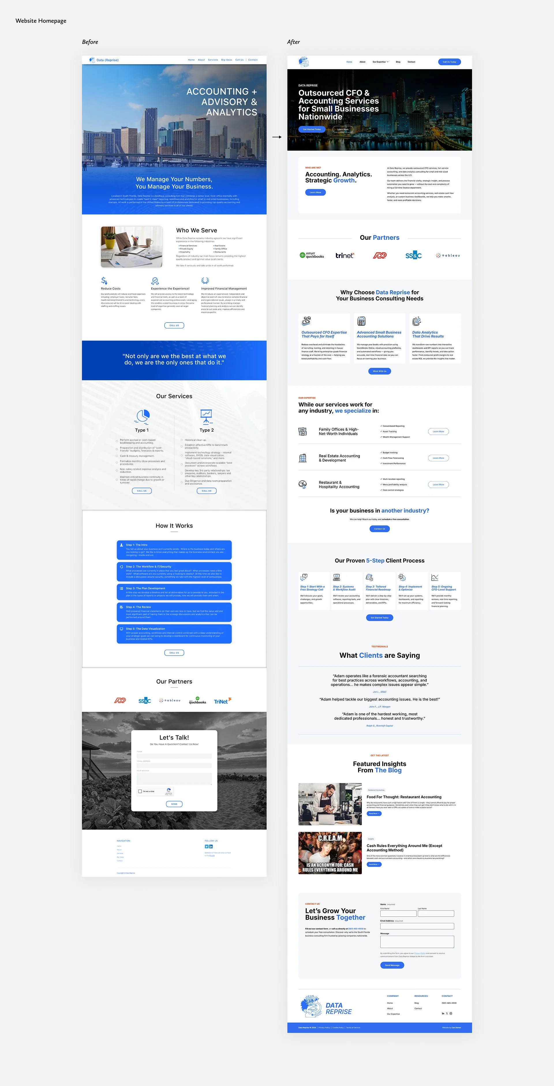I redesigned the website for Data Reprise, a boutique accounting, advisory, and analytics firm in South Florida serving small to mid-sized businesses. Since the old site was limited to a single landing page, I created a modern, professional, and easy-to-navigate platform with expanded services pages, a blog collection, clear calls to action, and streamlined contact options. Social proof is also integrated throughout the site via partner logos and testimonials, reinforcing credibility and highlighting the firm’s many years of experience to prospective clients.